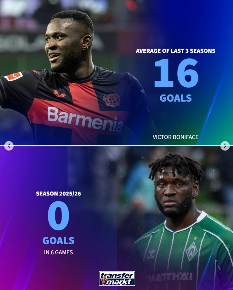 Boniface: 0 bàn sau 6 trận ở Bremen mùa này, trung bình 16 bàn trong 3 mùa giải trước