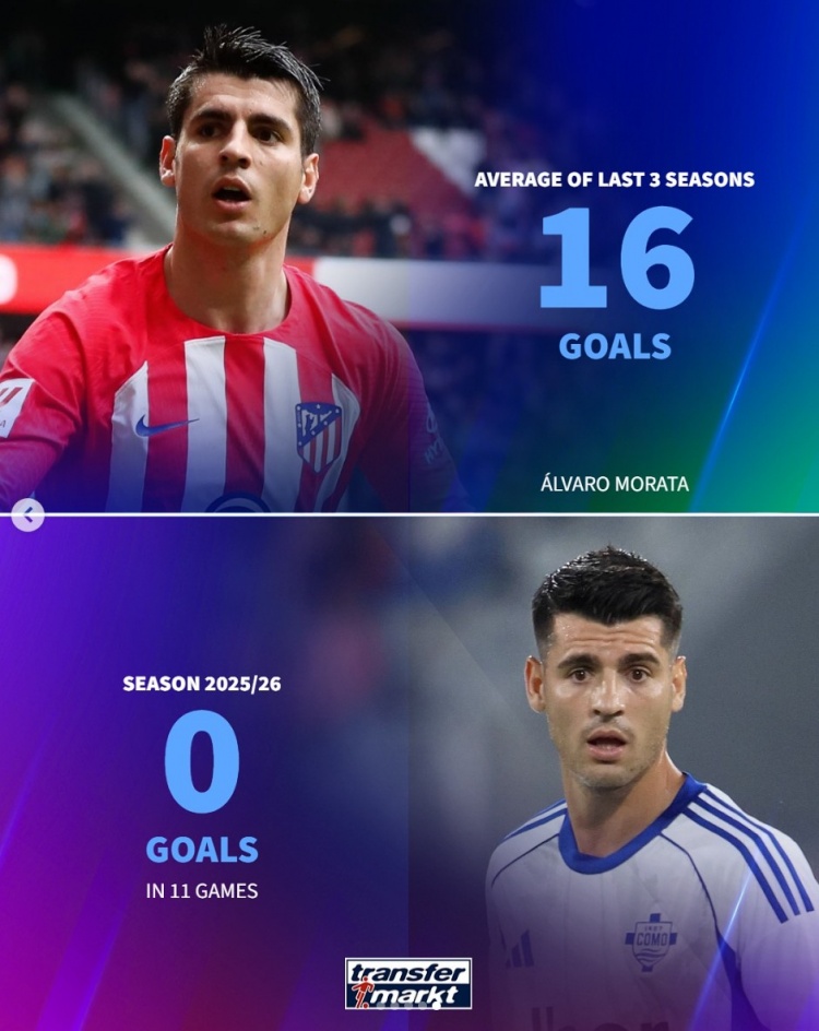 Morata: 0 bàn sau 11 trận ở Como mùa này, trung bình 16 bàn trong 3 mùa giải trước