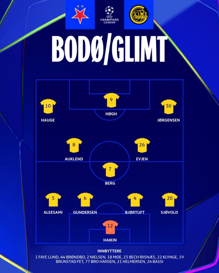 Trong vòng đầu tiên của giai đoạn Champions League, đội Séc Slavia Prague đã thi đấu với đội bóng Na Uy Bode tại nhà, và sự khởi đầu của cả hai bên đã được công bố. Slavia Prague: 36-stanick; 3-holesh, 4-zimma, 12-mbodge, 21-dodra, 23-satirek, 17-proward, 10-nafiris, 19-oscar-dolly, 9-kusei, 25-jorri